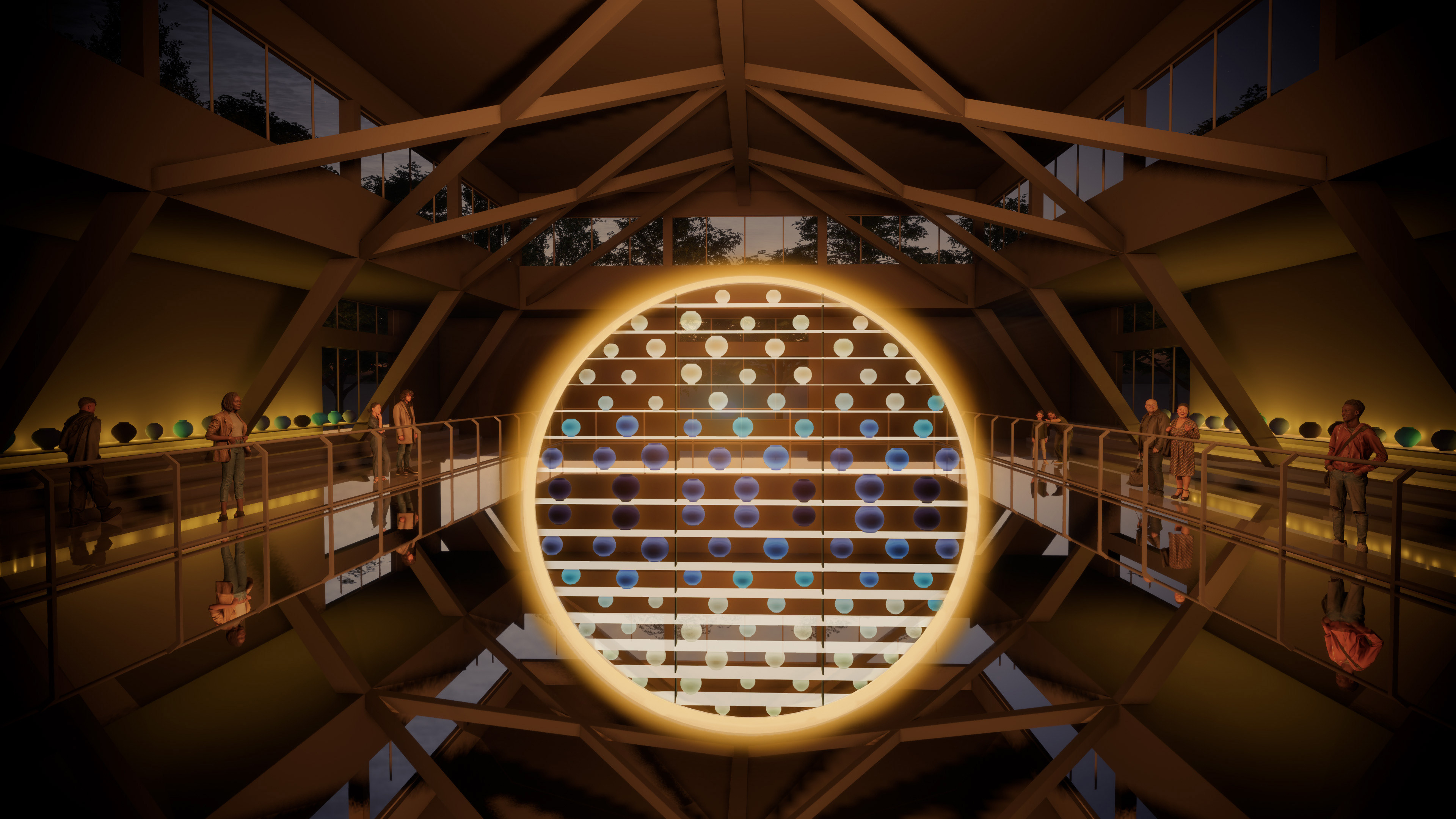 Една от ключовите локации на острова е изложбената зала „Пишина Гандини“ – бивш закрит басейн, трансформиран в светло, остъклено изложбено пространство, където се предвижда да бъдат разположени части от програмата на „Хомо Фабер“ 2026 / визуализация/рендър ©Es Devlin STUDIO
